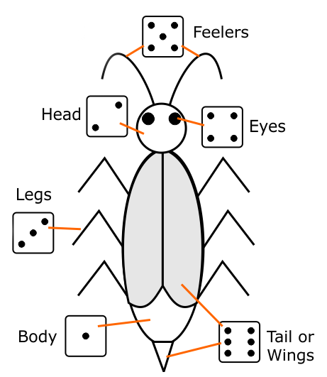 It is necessary to roll the correct number for the body before any other part may be drawn. To the body, one may attach the head, legs or wings, but the head must precede the antenna and eyes. The first player to draw all the requisite parts is the winner.